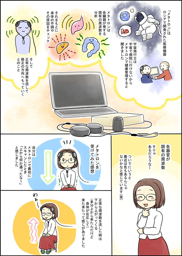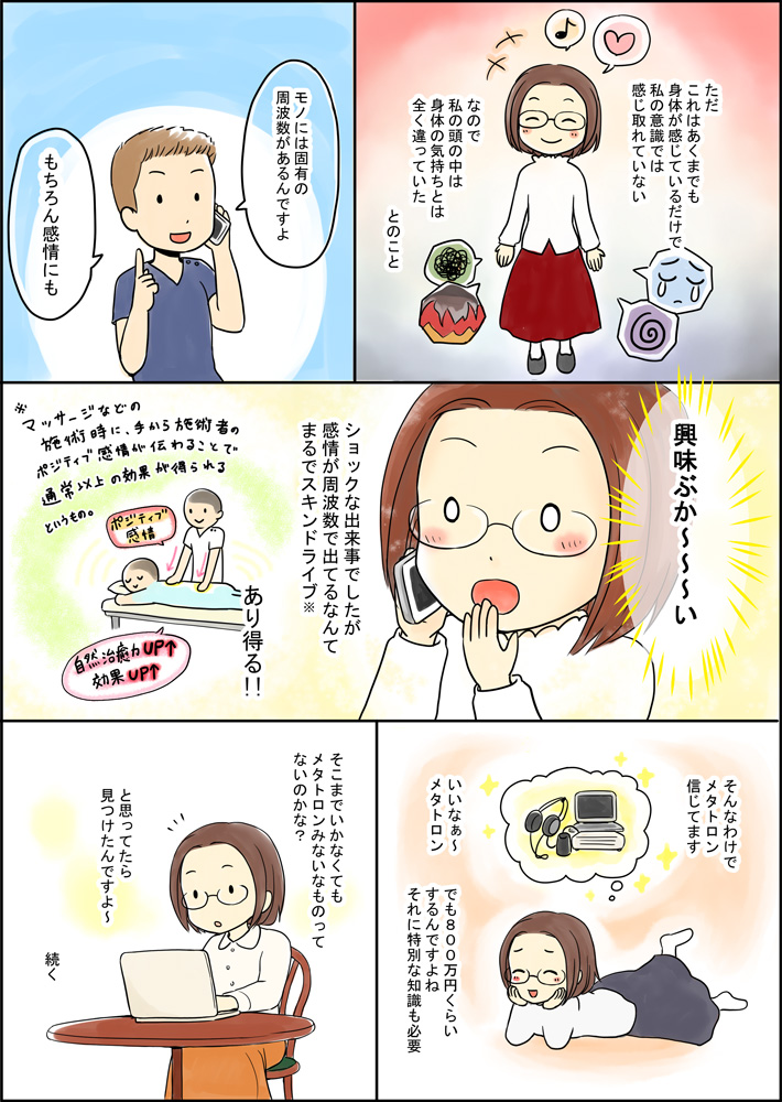 メタトロンの実体験 タイムウェーバーについて 2021-05-182026-02-02 メタトロンに行って来た実体験を、漫画家の「ササノユリ」さんにお願いして描いてもらいました。 ・・・で、タイムウェーバーを見つけてしまったワケなんですけどね・・・ スキンドライブ | て・おく