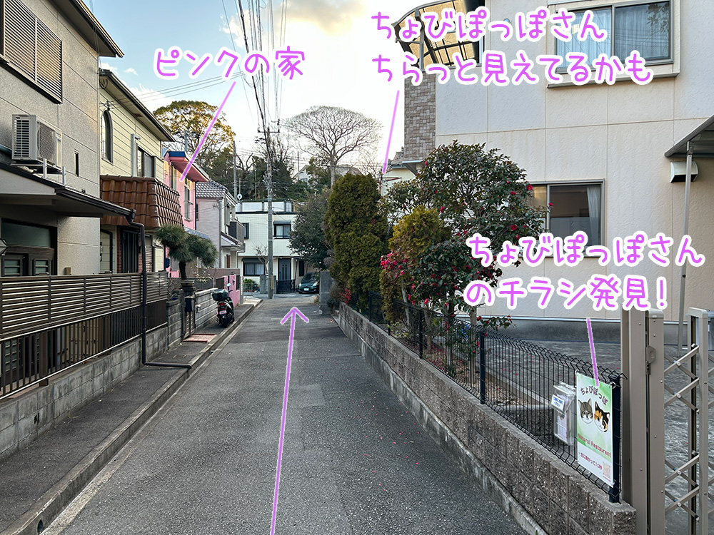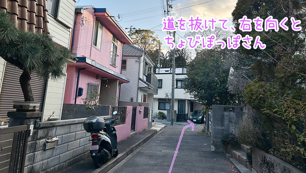 左側にピンクの壁の家が見えます。ピンクの壁のお家を通り過ぎ、右を見ると「ちよびぽっぽ」さんがあります。