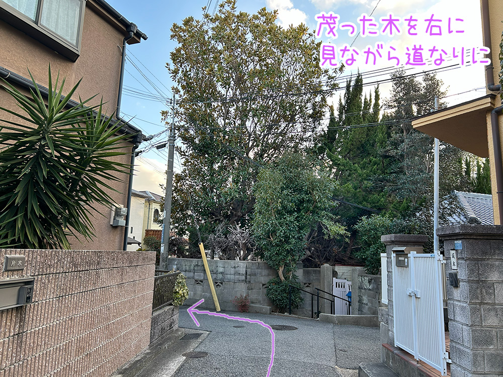 茂った木のお家を右に見ながら道なりに