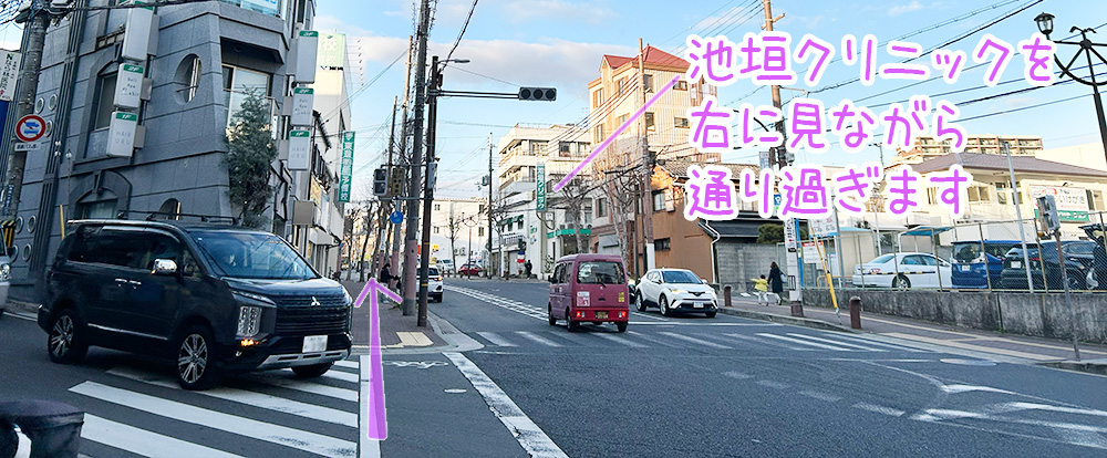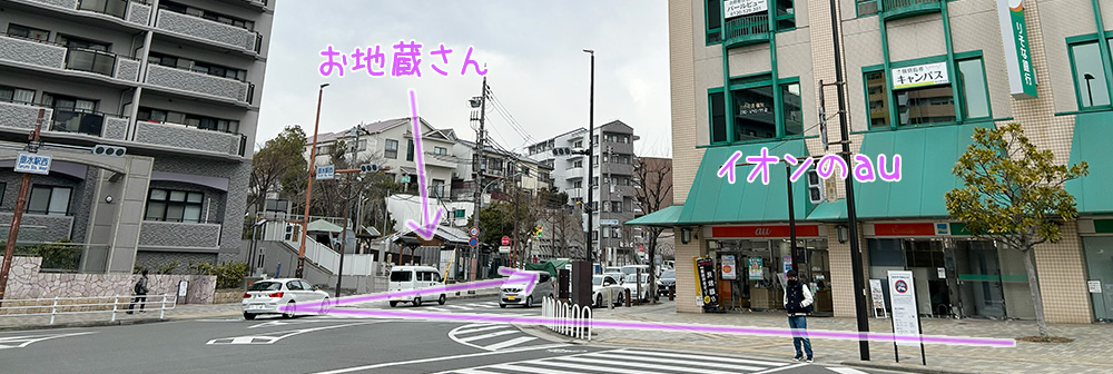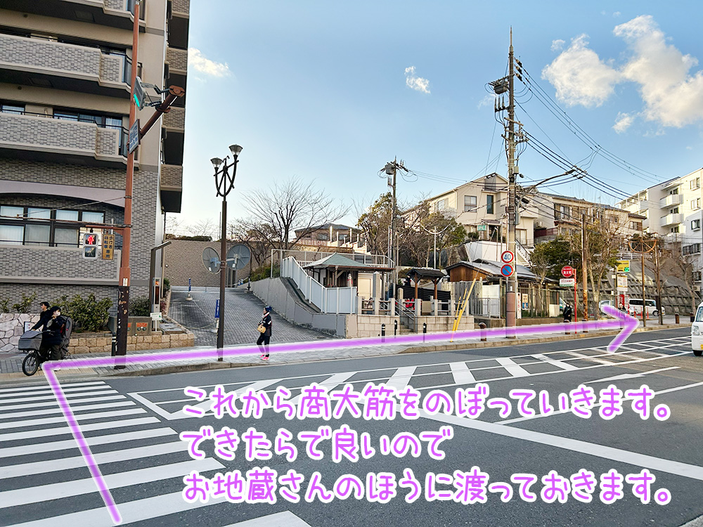 ここでできれば、向いの歩道のほう(お地蔵さんのほう)に、横断歩道を渡っておきます。