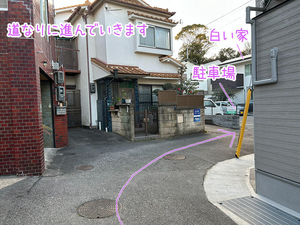 駐車場と白い家を左に見ながら通り過ぎ、先に進みます