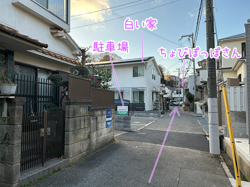駐車場から徒歩で ちょびぽっぽさんへ